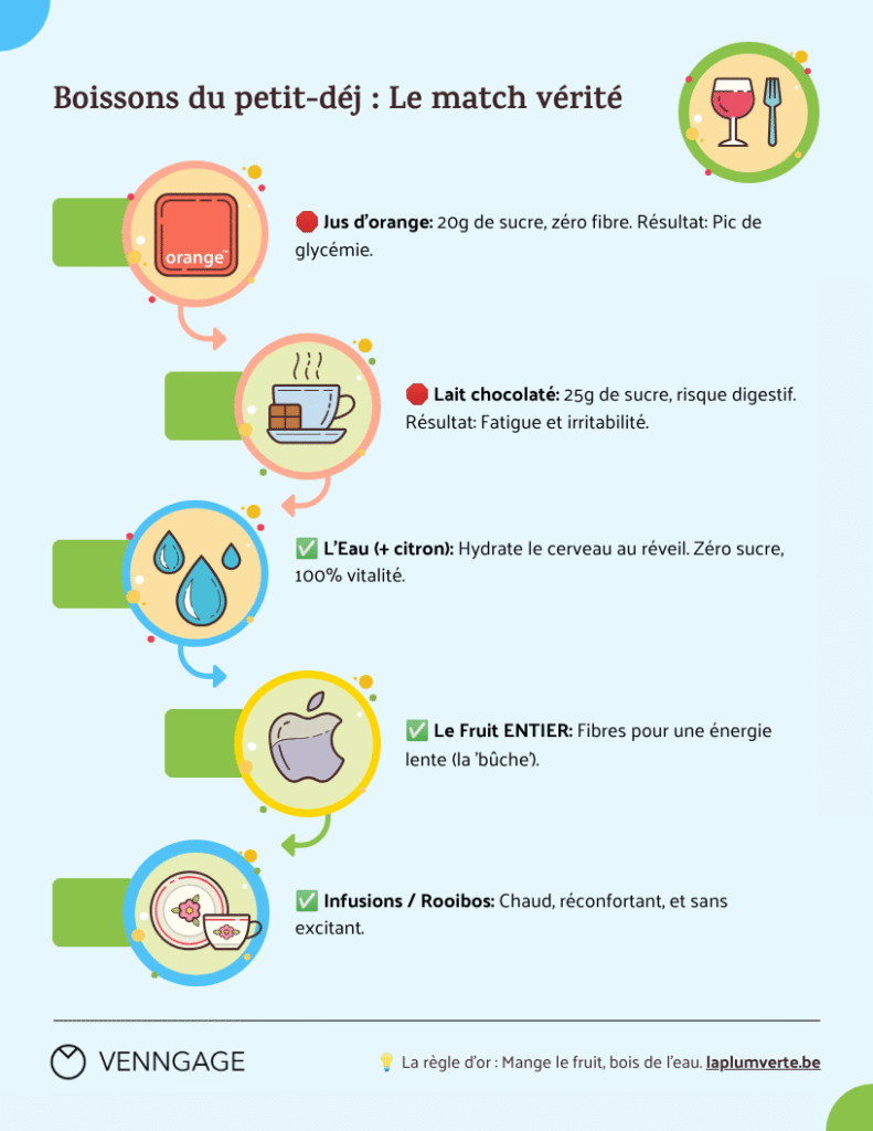 Le jus d’orange, même « 100% pur jus », n’est pas un fruit. C’est du sucre liquide qui programme le crash de 10h. Le lait chocolaté industriel, c’est une double peine : trop de sucre ajouté + problèmes digestifs possibles.